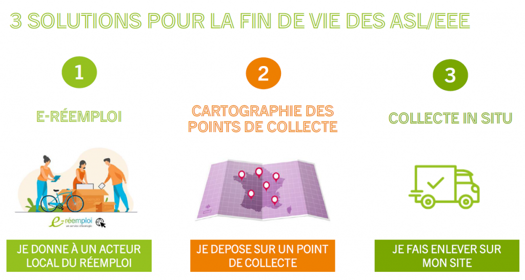 - Acteurs de l’Économie Sociale et Solidaire (ESS) : Ce matériel est confié à un réseau de plus de 550 acteurs de l’ESS référencés par Ecologic (associations, entreprises d’insertion, recycleries).